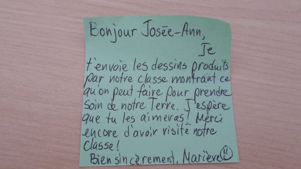 Une belle note et cadeau reçu dans la malle juste à temps pour la dernière journée des Écoles vertes. Un grand merci à la class de 2e année de Madame Mariève au Centre Scolaire de la Rive Sud pour les beaux dessins pour la Terre!