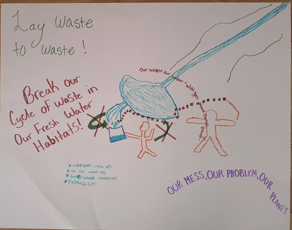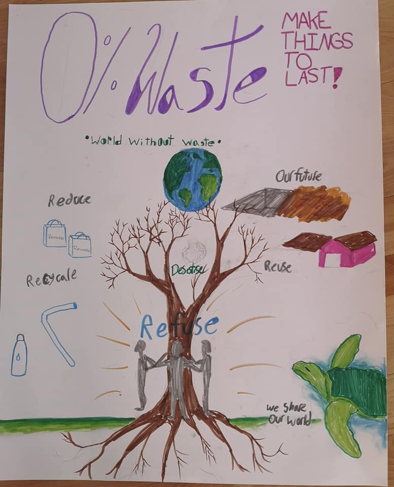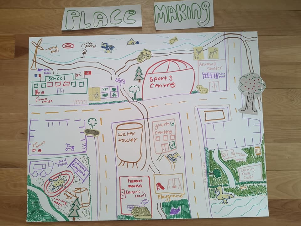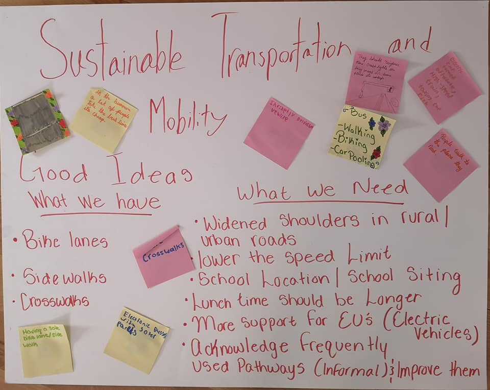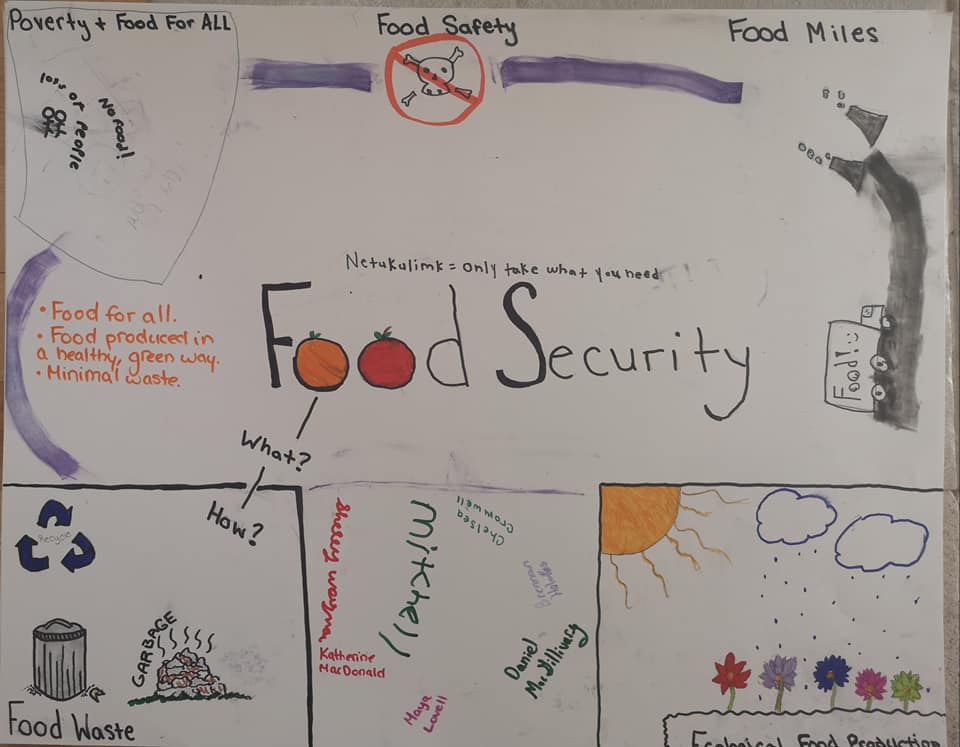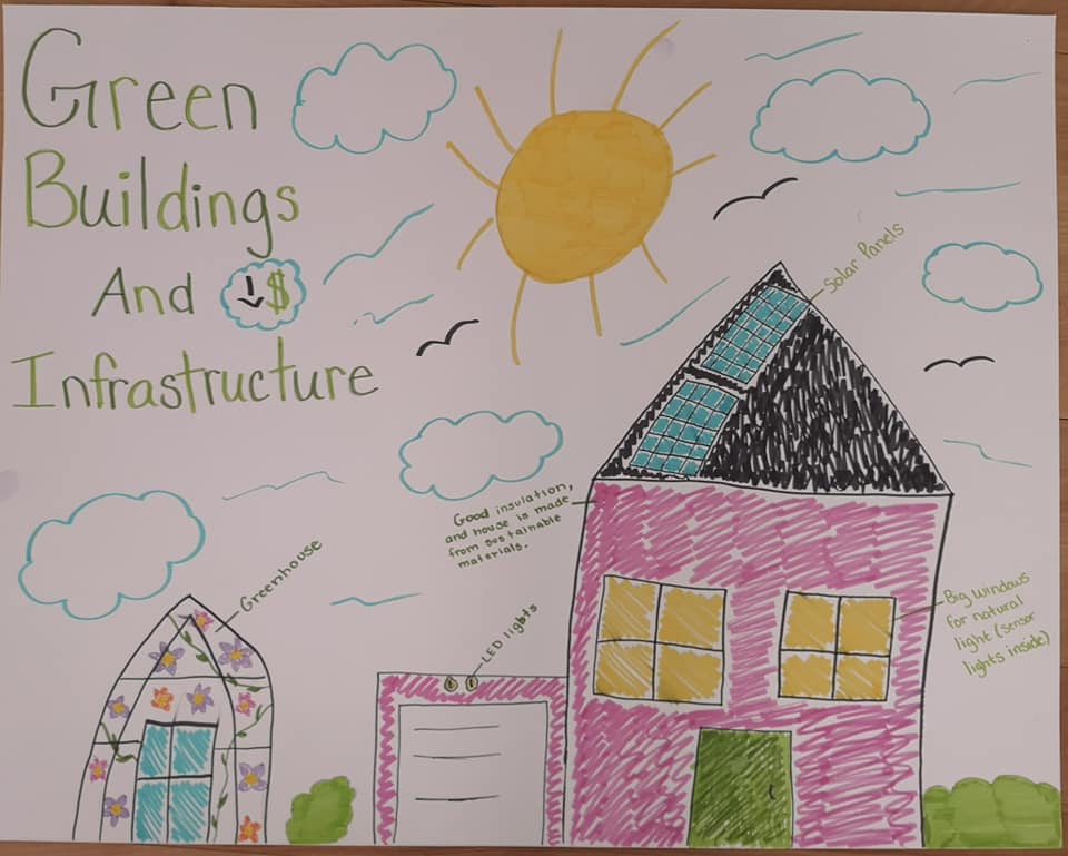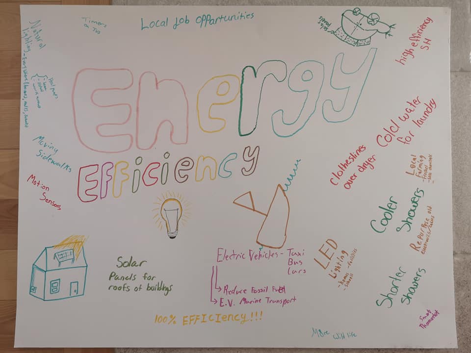 Students participated in an exercise called E-Mission. Students were divided into nine groups: Energy Efficiency, Renewable Energy, Water Conservation, Waste Management, Transportation, Inclusive Sustainable Economy, Placemaking, Food Security, and Green Buildings and Infrastructure. Each group included students from different schools across the Island and a mentor. Our amazing mentors had expertise in a particular field and a passion for working with youth. Each group spent some time getting to know each other. Then they brainstormed all the ideas, questions, and issues they could think of for their topic. Their final project was to create a visual representation of what a net-zero Cape Breton community could look like. Communicating their ideas visually brought out even more of their talent as the artists in the group stepped forward and everyone pitched in to add a splash of colour to their posters.