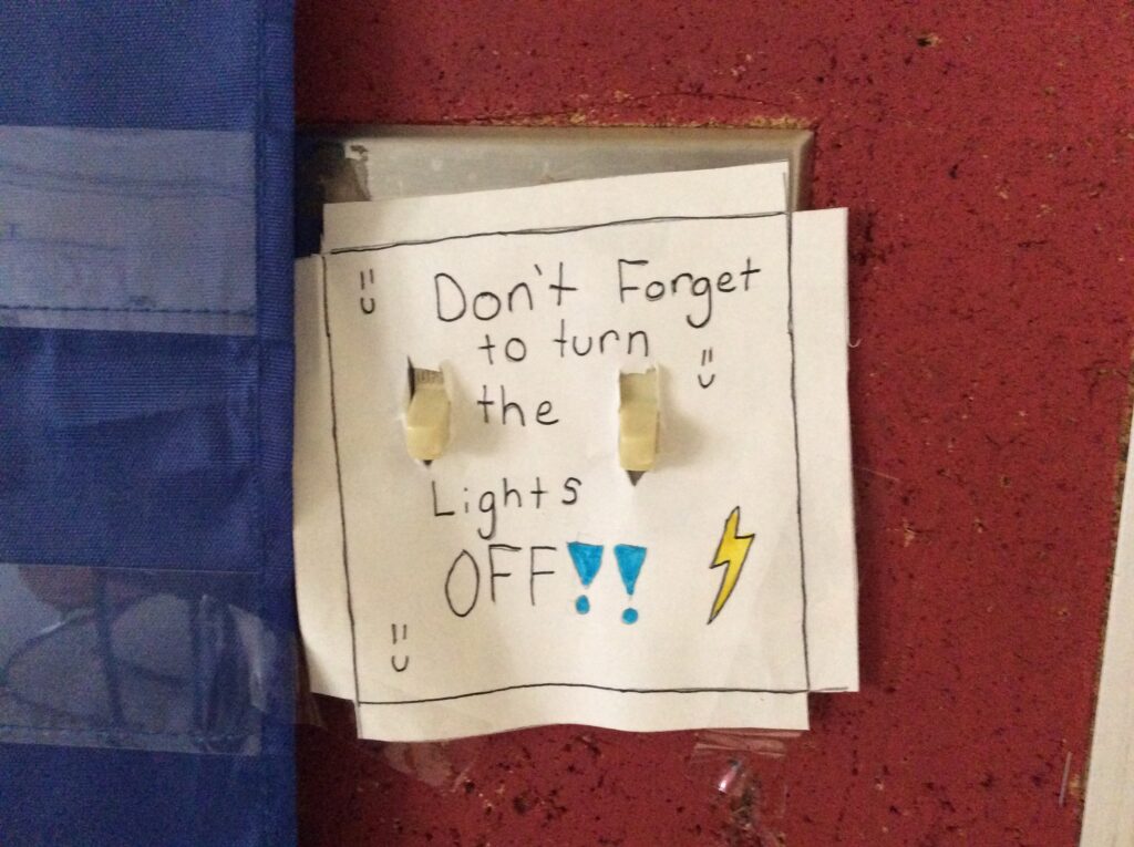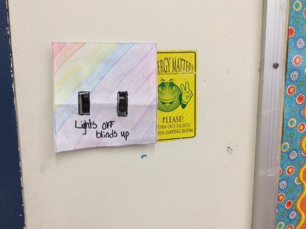 • “Tell the other classes to turn off their lights and electronics when done/not in use, not use the smartboard as much, unplug ipads if it is at 100%, lights off curtains open, turn speakers off when not in use”