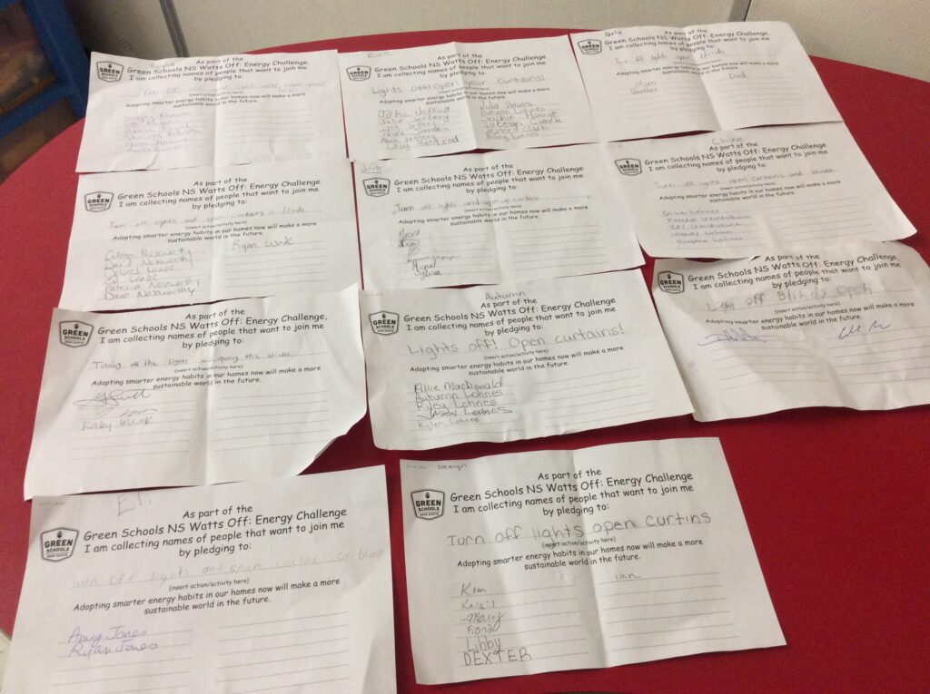 We are thrilled to see the activities being brought home. Students are becoming the energy efficiency experts of their homes and encouraging their families to make energy saving commitments. The students were able to get over 160 signatures from families, community members, and/or friends commiting to “adopting smarter energy habits in our homes now will make a more sustainable world in the future.” Over 160 people across the province are ready to make changes to support our teams, and taking action to be more energy efficient.